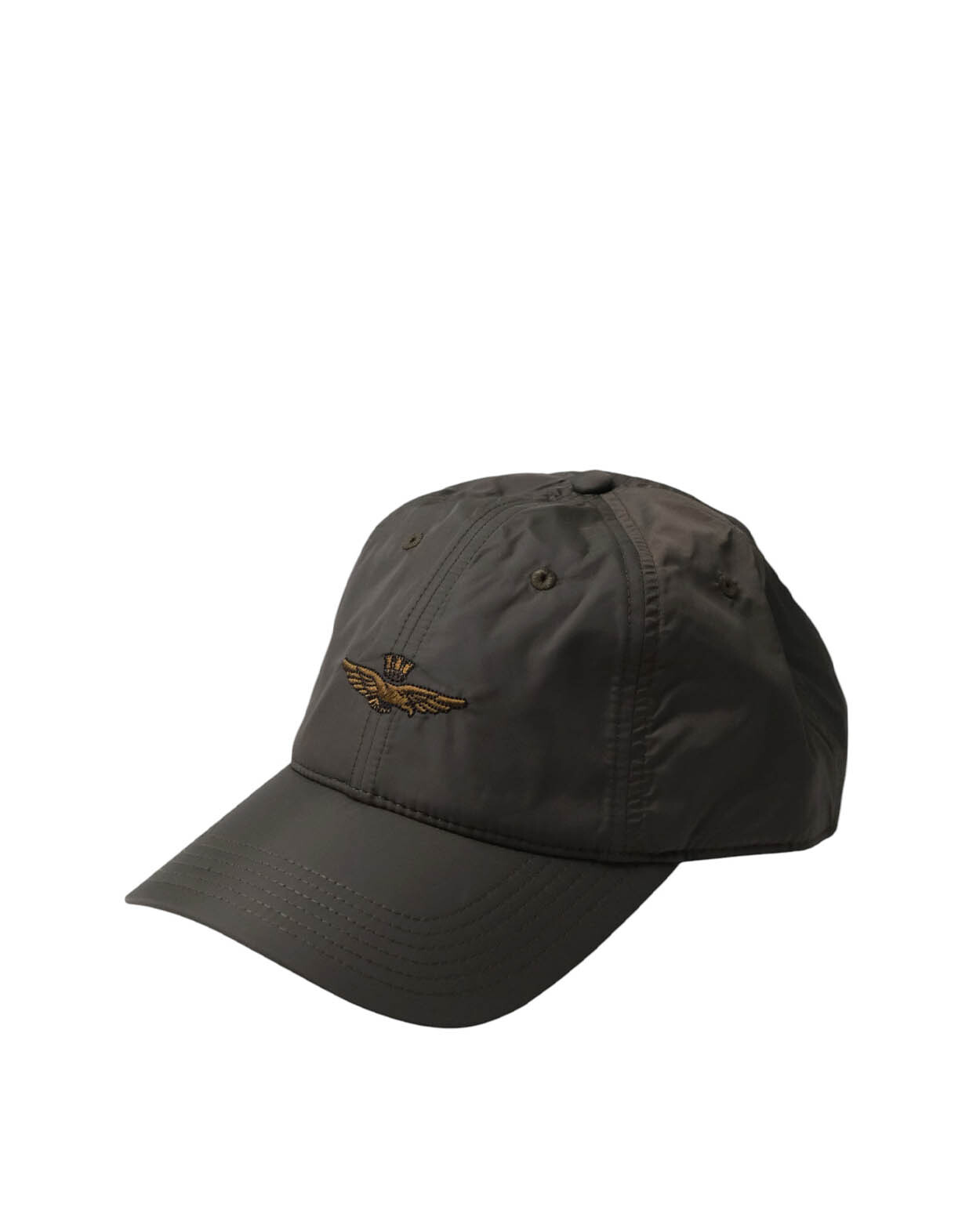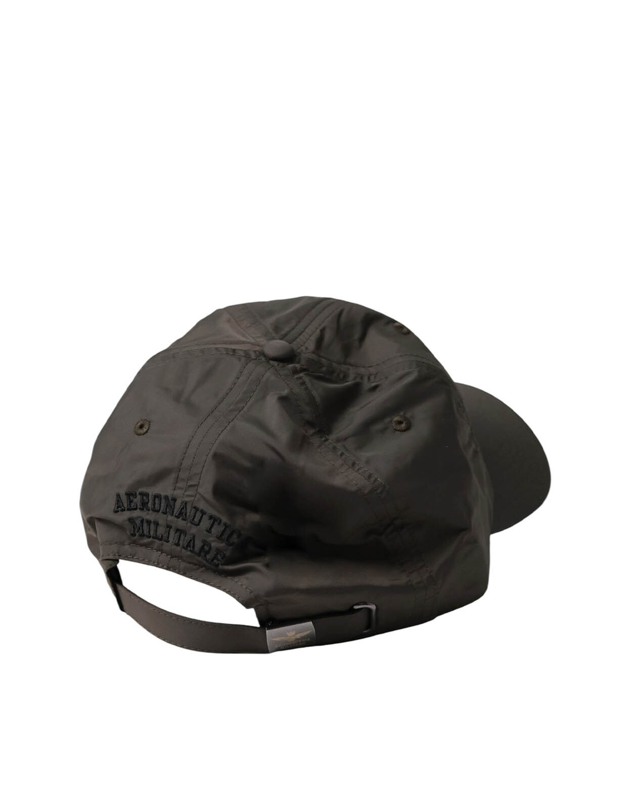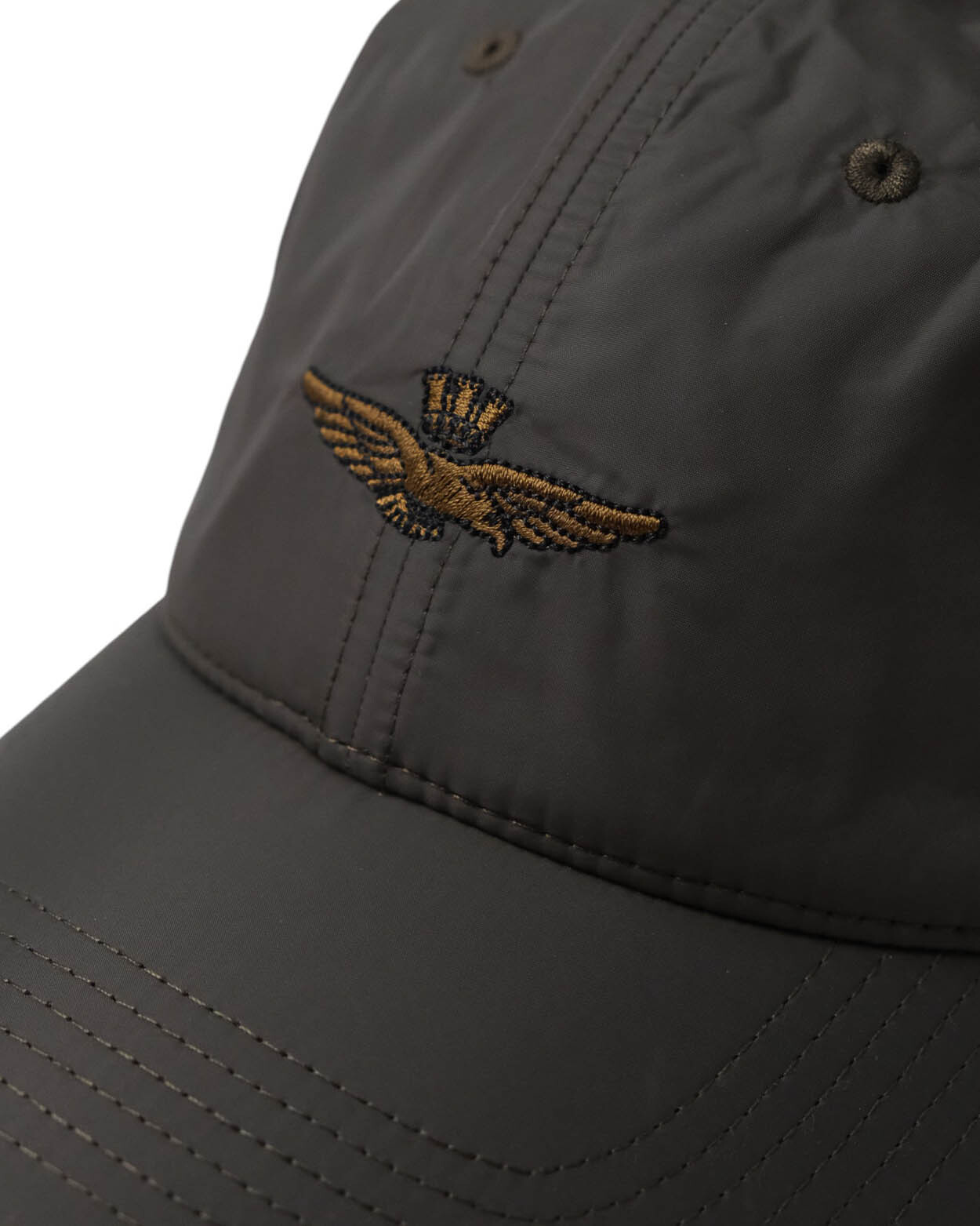 Бейсболку из хлопковой ткани окрасили в готовом виде, придав ей состаренный вид. Модель с брендированной пряжкой на регулируемом ремешке украсили патчем с символикой авиационной группы Squadriglia degli Assi спереди, нашивкой с логотипом сбоку и вышитой эмблемой АМ сзади.