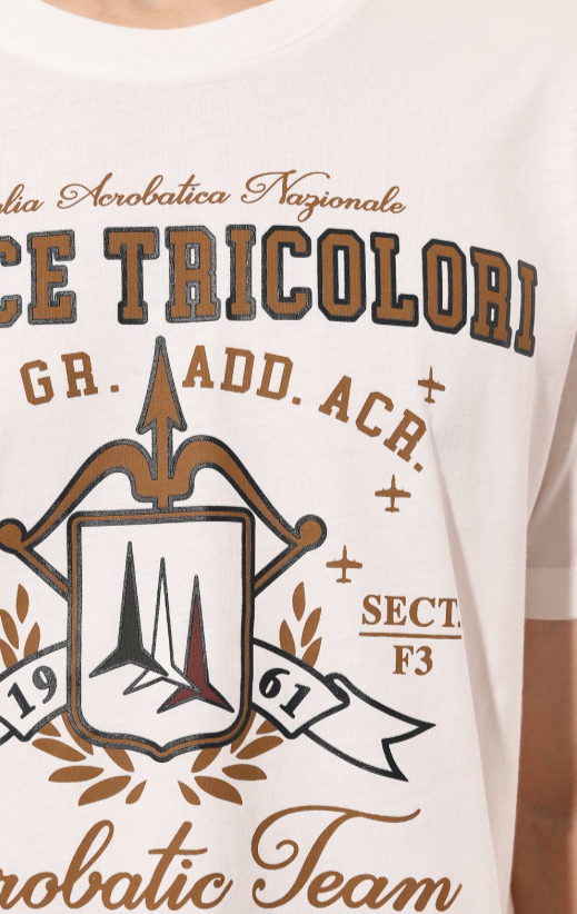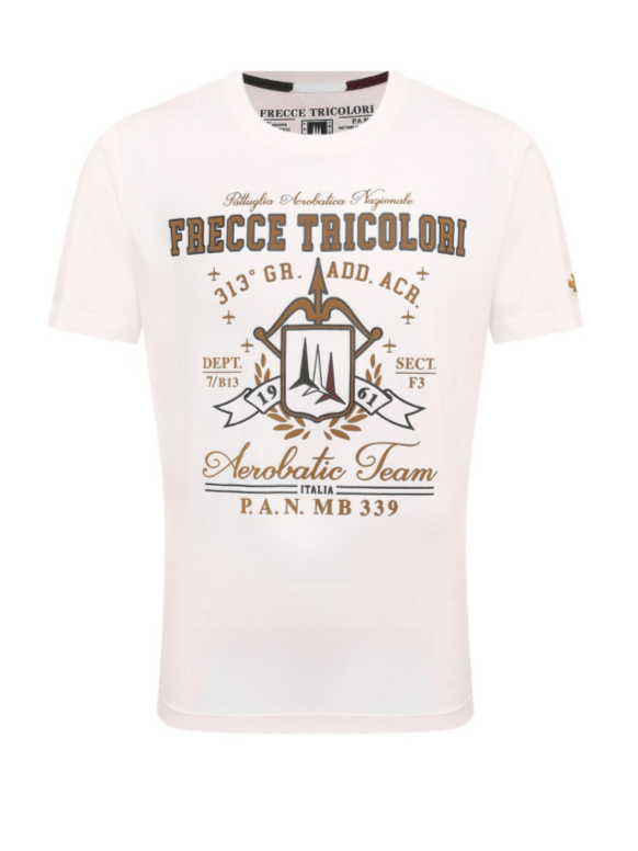 Прямую футболку из хлопкового джерси украсили спереди флокированным мотивом Tornado. Узор дополнили вышивкой с логотипом и эмблемой бренда.