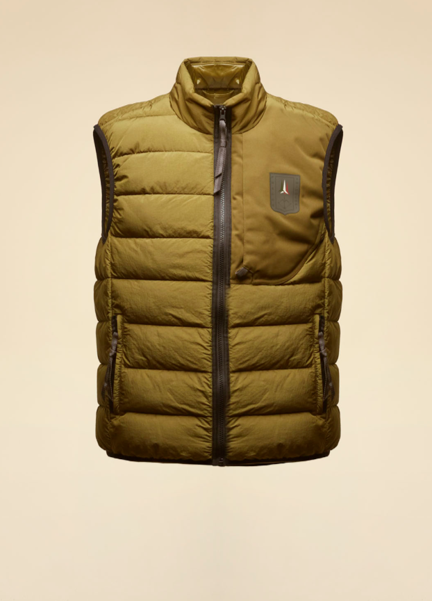 Современный универсальный жилет из нейлона с эффектом мятой ткани, отличающийся характерной текстурой и стильным внешним видом. Сверхлегкая подкладка обеспечивает тепло, не утяжеляя изделие, что делает его идеальным как для путешествий, так и для повседневной носки. Гладкий нейлон с карманом на молнии и термонаклейкой с логотипом Frecce Tricolori.