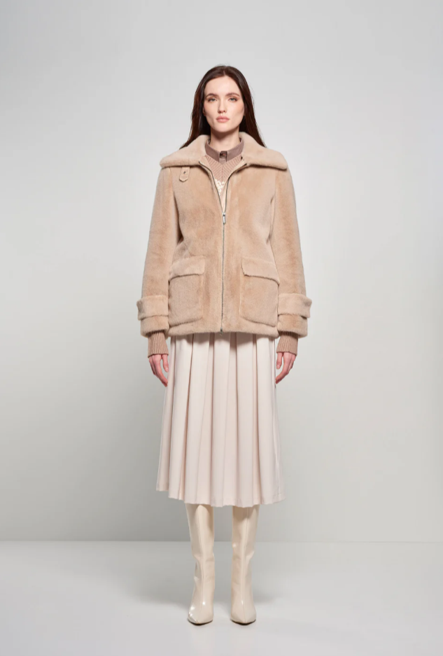 Эта короткая женская куртка из искусственного меха под кролика — идеальный баланс между теплом и стилем для прохладных дней. Ткань из высококачественного полиэстера имитирует натуральный мех, обеспечивая долговечность и изысканный внешний вид.Широкий и высокий воротник эффективно защищает от ветра и придаёт образу элегантность, а металлическая молния обеспечивает практичность и современный дизайн. Лёгкая подкладка сохраняет прямой крой куртки, подчёркивая силуэт, но не сковывая движений, что придаёт ей современный вид, подходящий как для работы, так и для отдыха.