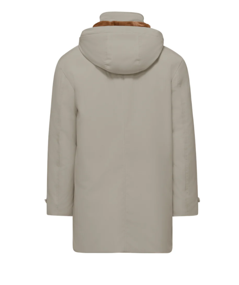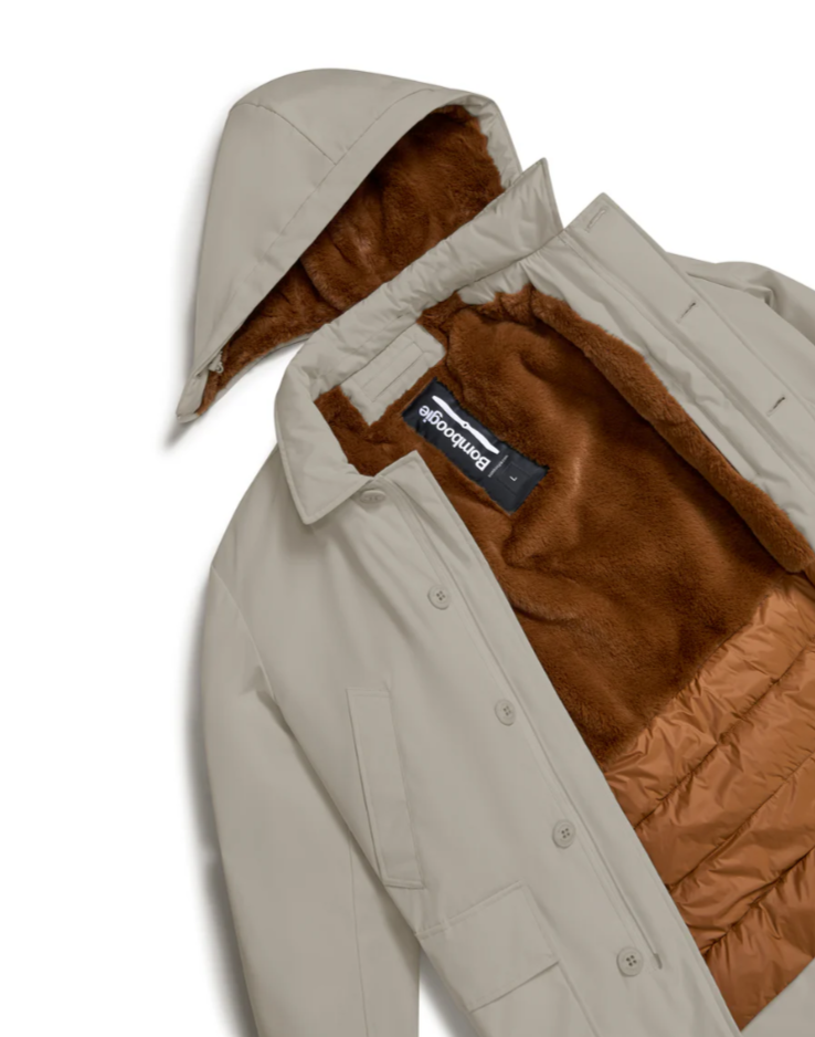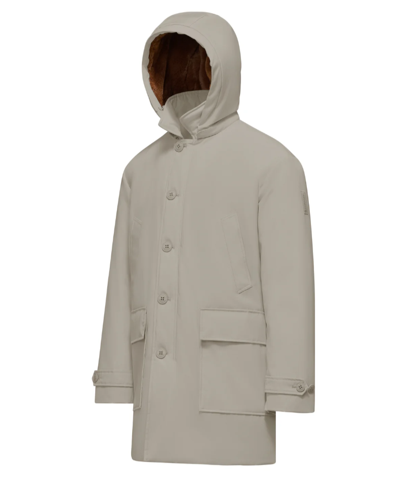Экологичный и функциональный дизайн. Эта парка изготовлена из переработанного нейлона с подкладкой из полиэстера, что отражает заботу об окружающей среде без ущерба для стиля и функциональности. Основной капюшон снимается с помощью кнопок, а второй капюшон, встроенный в воротник, обеспечивает дополнительную защиту, не утяжеляя изделие. Синтетический мех с коротким ворсом украшает край капюшона, придавая ему стильный вид. Водонепроницаемый и ветрозащитная внешняя ткань защищает от непогоды, сохраняя тепло. Эта зимняя парка, идеально подходящая для города, сочетает в себе эстетику, функциональность и экологичность, отвечая требованиям современного гардероба.