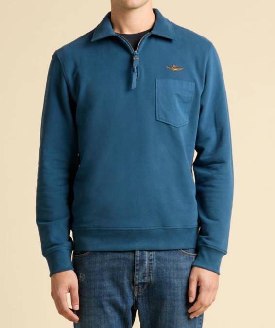 Эта толстовка представляет собой уникальный гибрид непринужденного комфорта и стильного кроя. Она сочетает в себе мягкость эластичного хлопка и элегантность воротника. Благодаря застежке-молнии, открывающей футболку с круглым вырезом, габардиновому нагрудному карману и вышитой эмблеме в виде орла, она идеально подойдет всем, кто ценит стиль и универсальность.